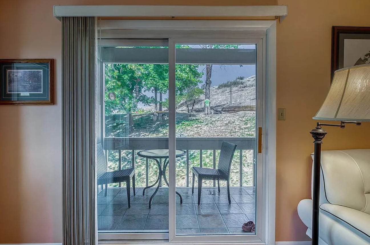 The main living area includes a cozy gas fireplace and direct access to a private balcony with sweeping views of the valley.