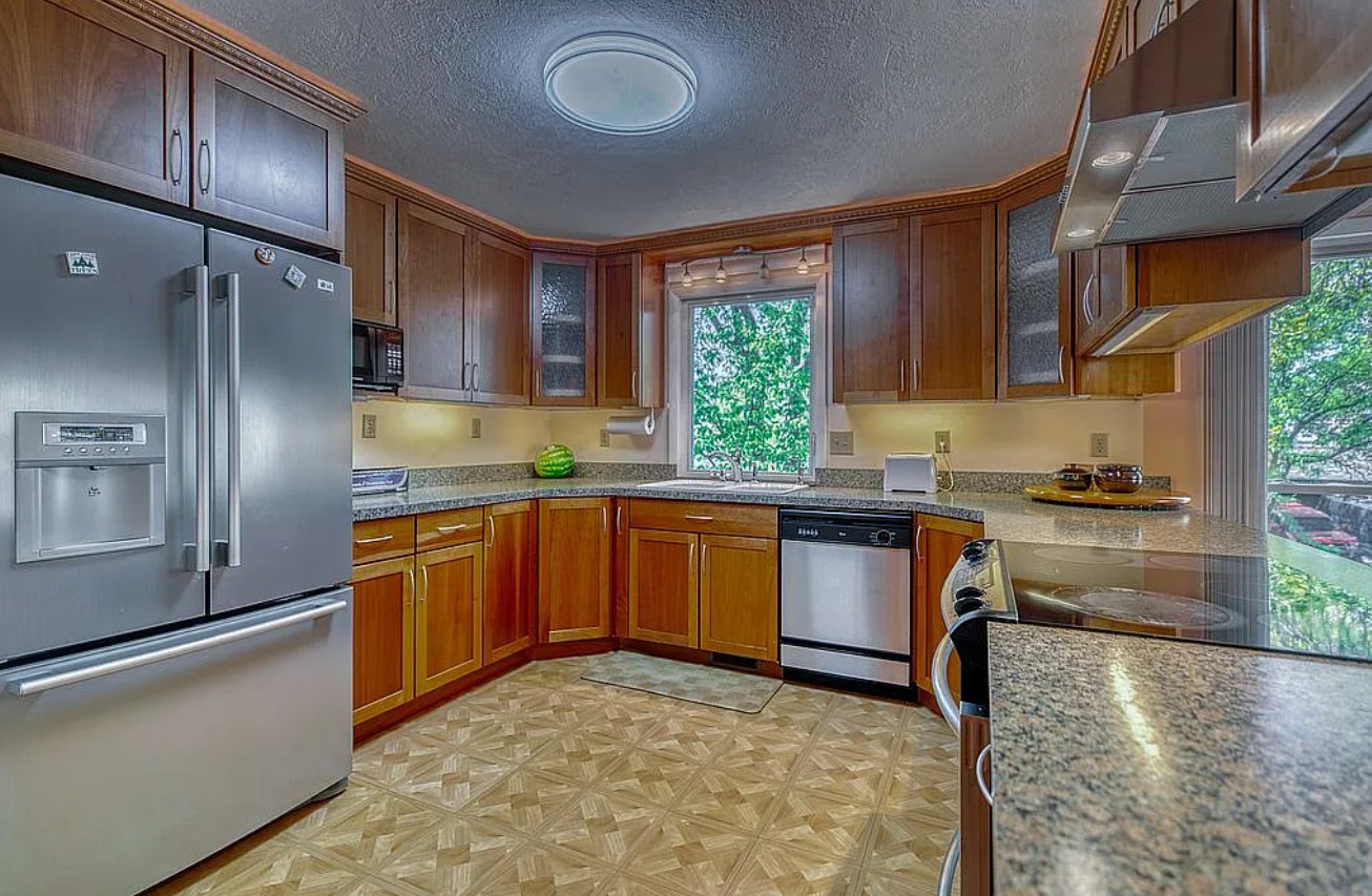 The kitchen is well-appointed with expansive countertops, beautiful cherry wood cabinets, abundant storage, and a generous pantry.