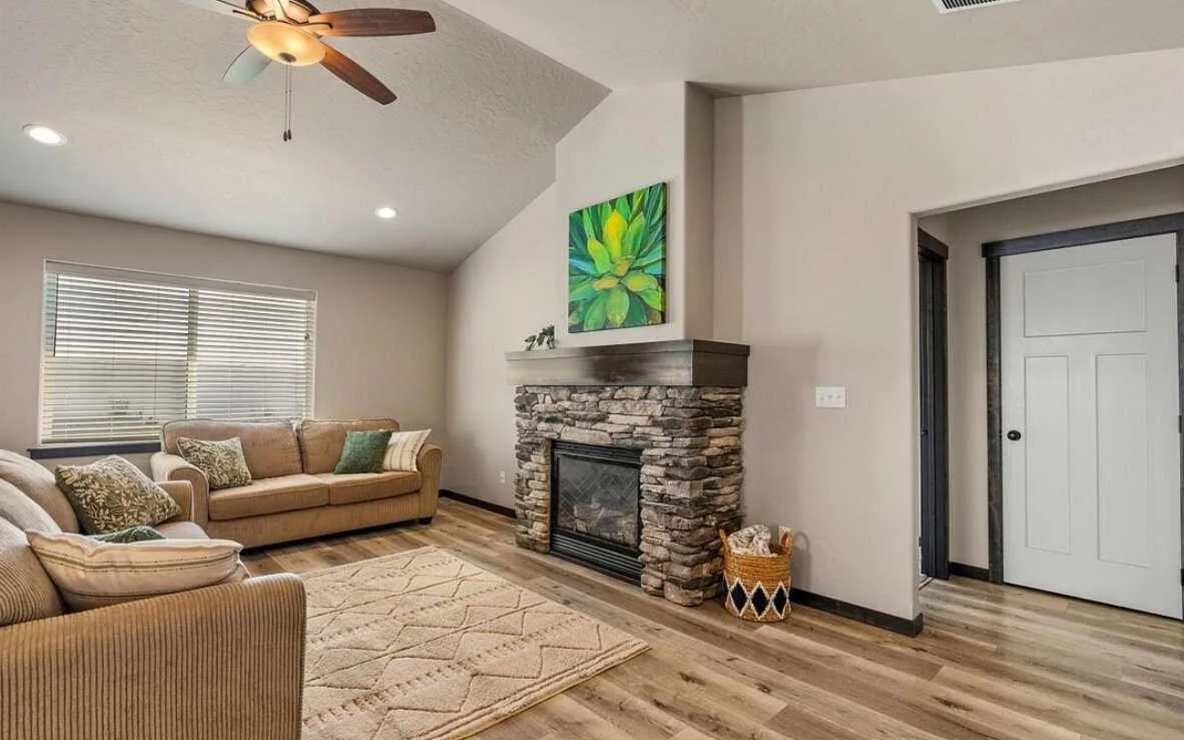 At the heart of the home, the living room features a cozy gas fireplace, perfect for North Idaho winters, while the kitchen showcases quartz countertops, modern cabinetry, and ample workspace for everyday cooking and entertaining.