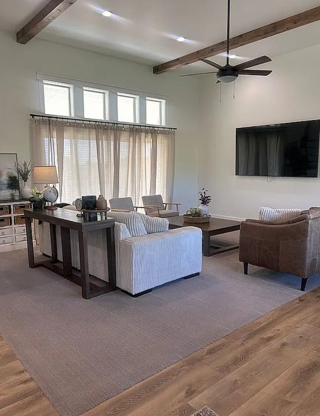 Inside, you'll find a spacious open-concept layout with vaulted ceilings accented by exposed beams, creating a bright and airy living space filled with natural light.