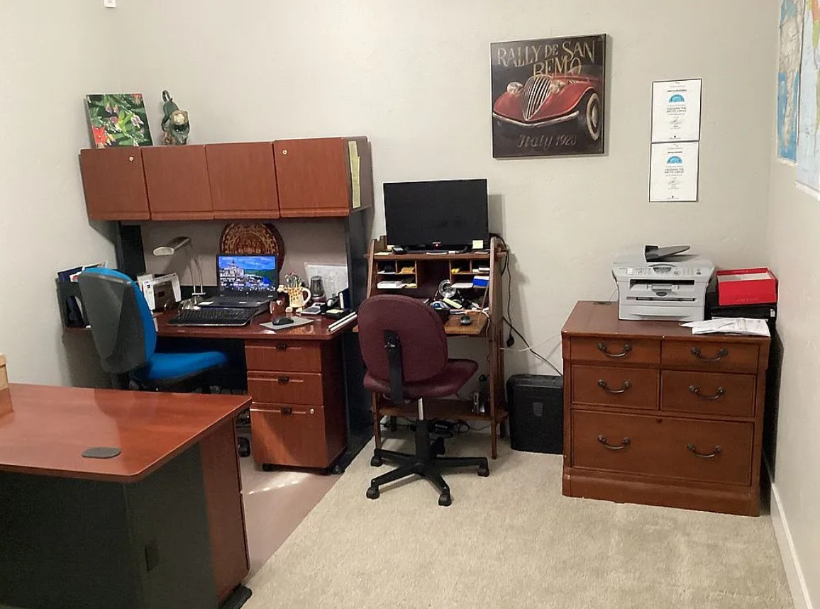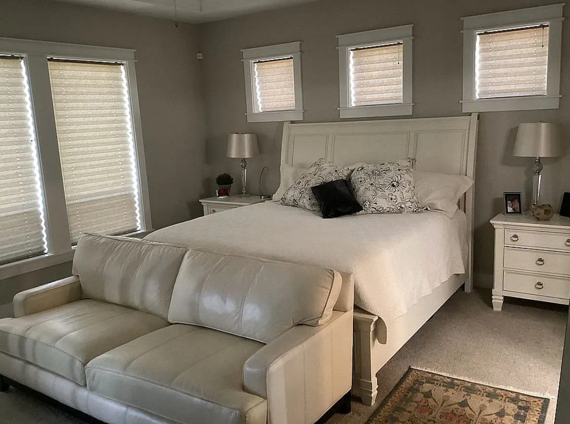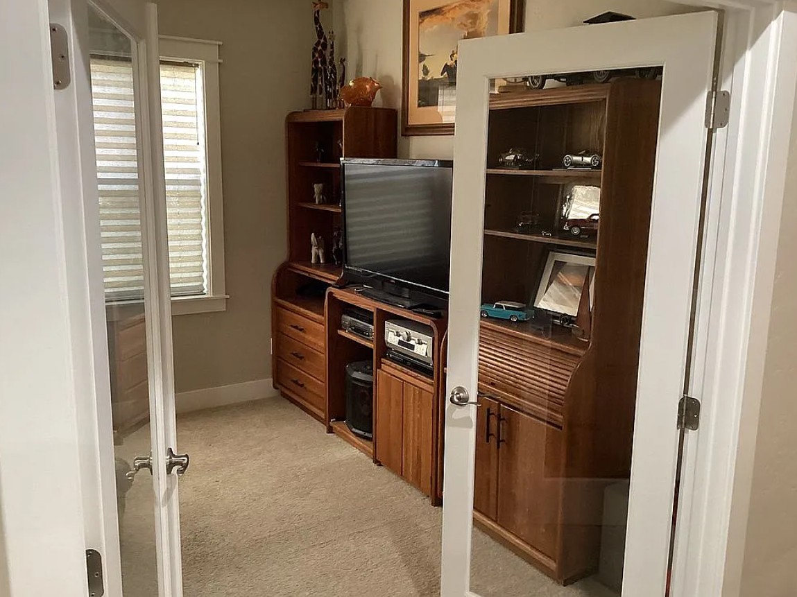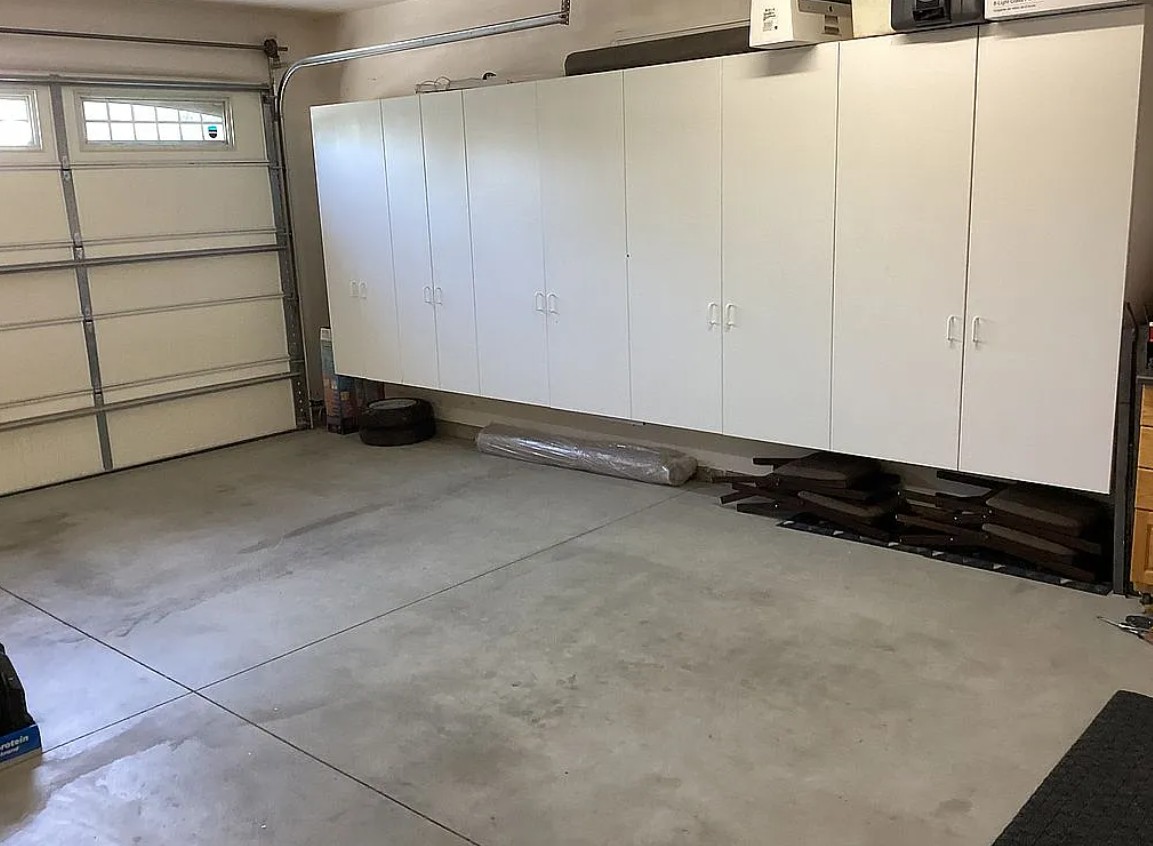 The oversized 3-car garage includes extensive enclosed storage, a dedicated 6' x 10' workspace, and a mini-split air conditioner for year-round comfort perfect for hobbies, DIY projects, or a home workshop.