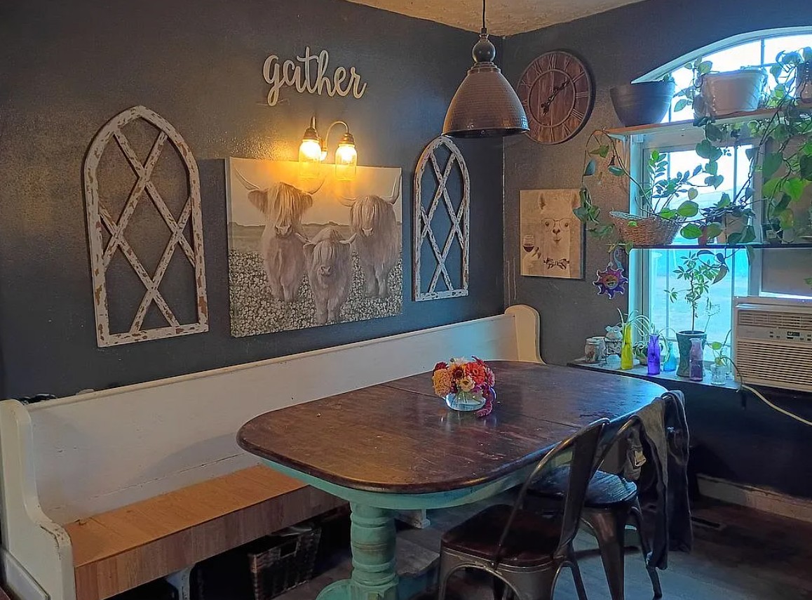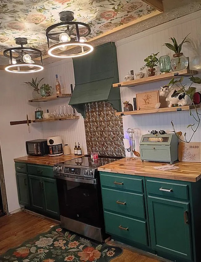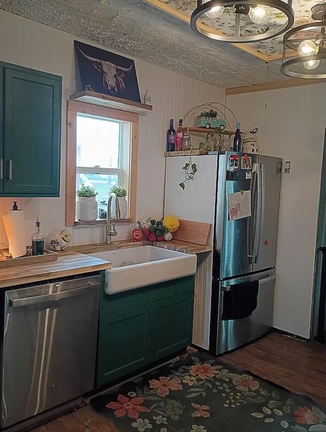 Inside, the home features a newly remodeled kitchen equipped with butcher block countertops and a full suite of stainless steel appliances, including a new GE refrigerator, dishwasher, and Ranch brand stainless steel range.