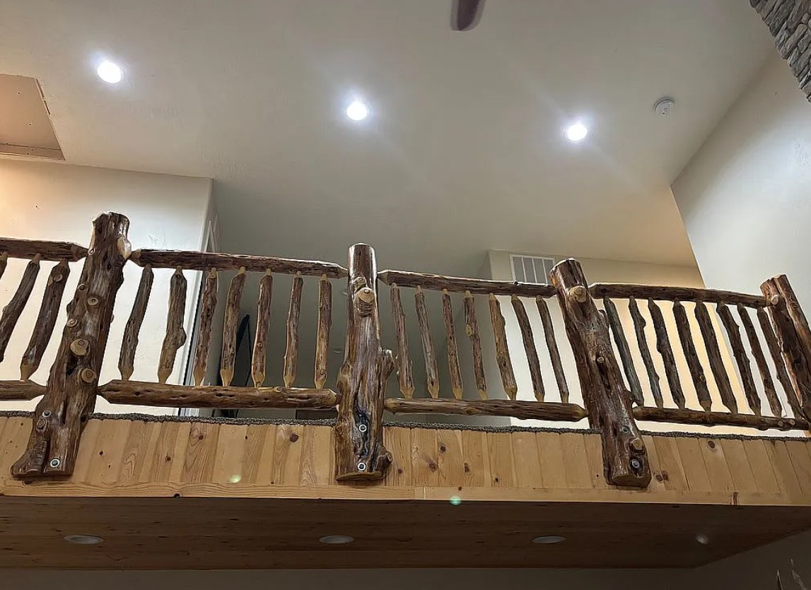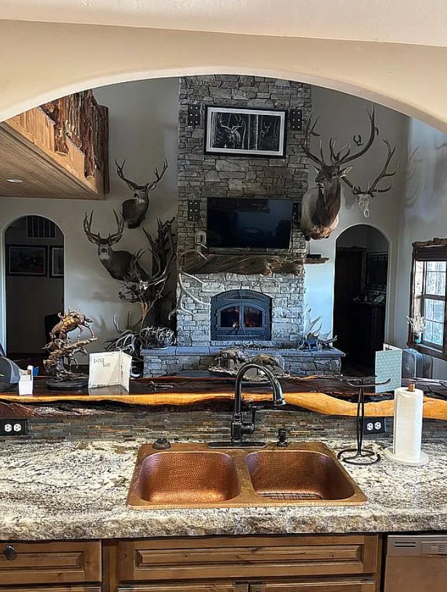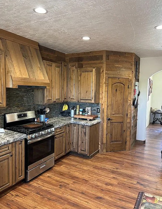Inside, you’ll find rich wood cabinetry, natural stone accents, and custom rustic finishes throughout, creating a warm and inviting atmosphere.