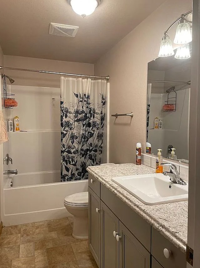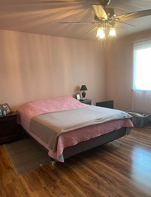 Flooring includes laminate in the living room and bedrooms, and durable vinyl in the bathrooms and utility room.