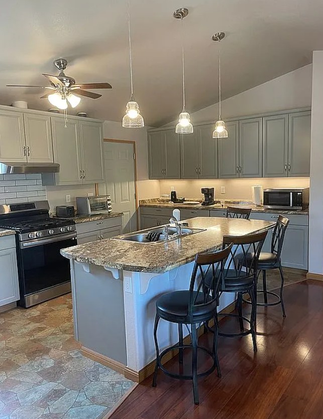 The spacious kitchen includes a breakfast bar for four and comes fully stocked with a gas range/oven, dishwasher, and refrigerator.