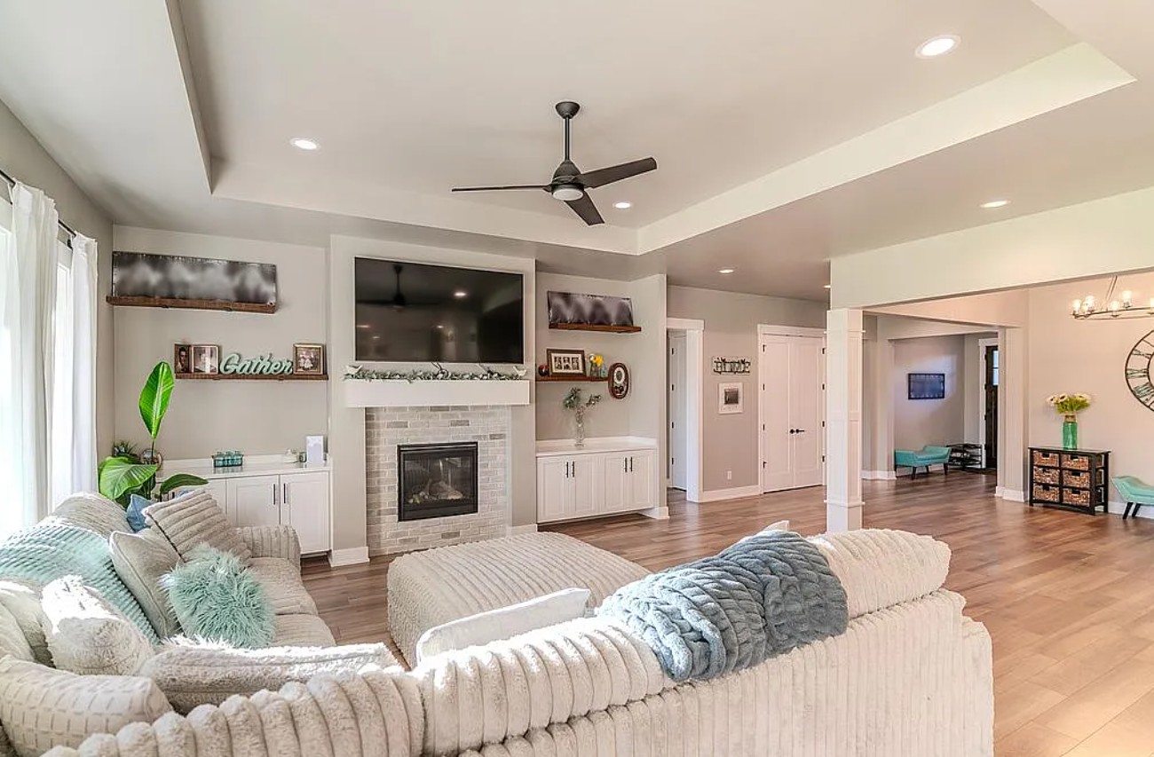 The spacious great room includes a cozy fireplace with custom built-ins, while the gourmet kitchen boasts quartz countertops, a large island, stainless steel appliances, abundant cabinetry, and a walk-in pantry.