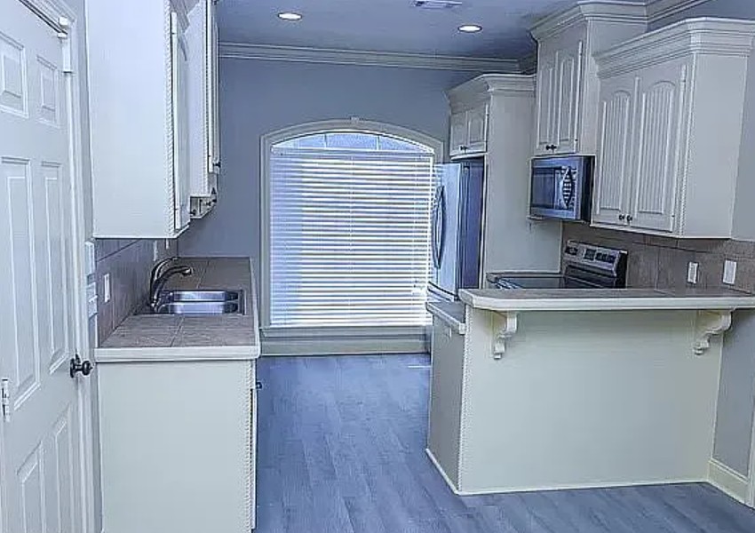 The updated kitchen boasts modern appliances, including a stainless steel side-by-side refrigerator, stove, and microwave.