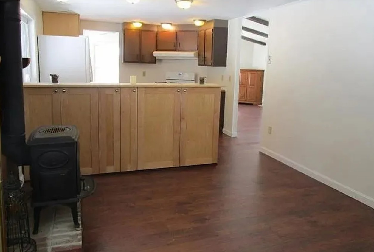 Inside, the home features a cozy living area with a pellet stove and hearth, creating a warm and inviting atmosphere.