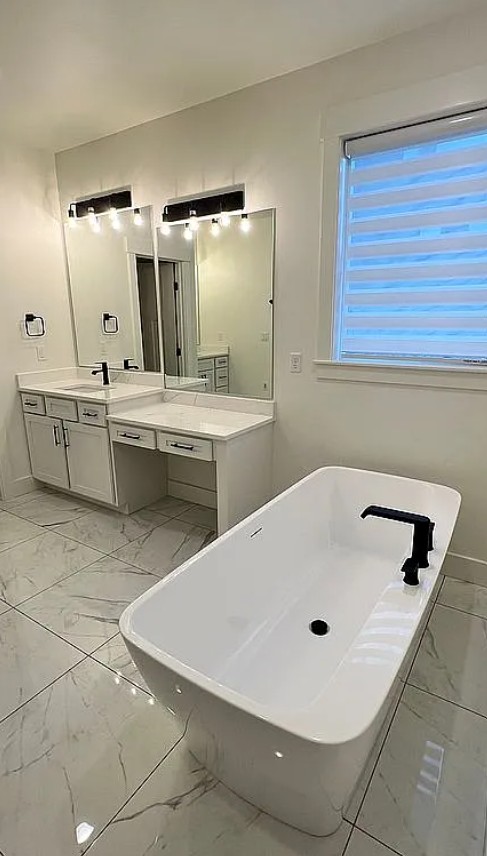 The master suite features a spa-like bathroom complete with a free standing soaking tub, large tiled shower with built-in steam system, dual vanities, and a dedicated makeup table.