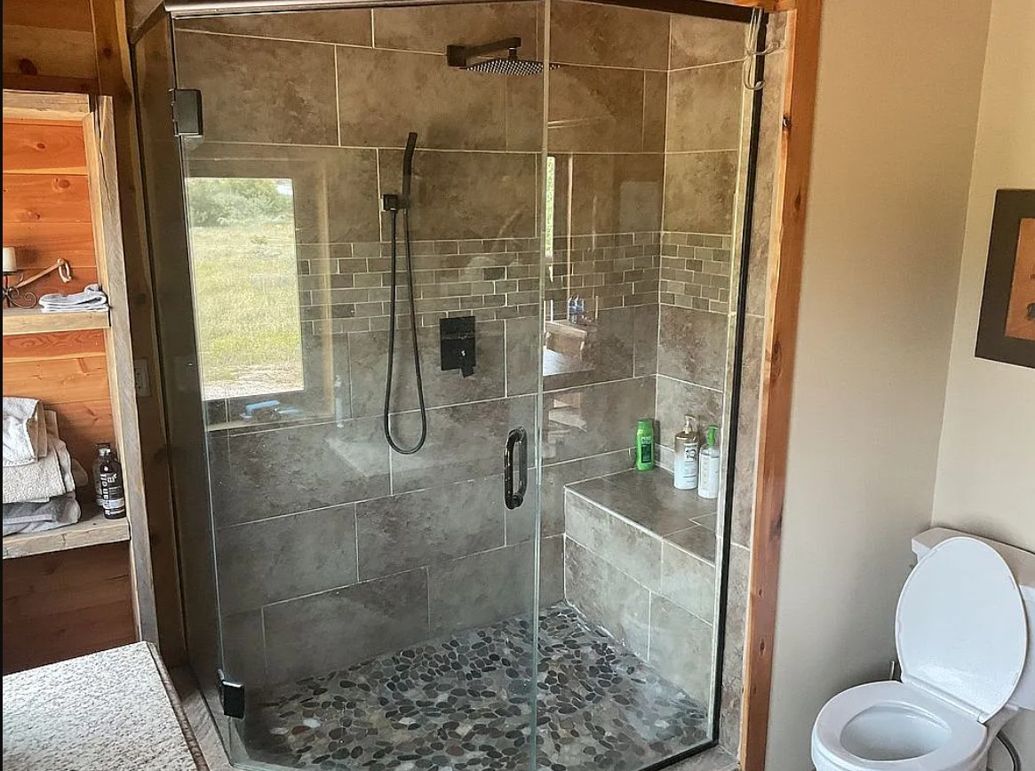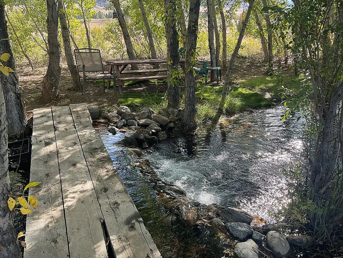 A peaceful stream flows right behind the cabin, adding to the serene setting.