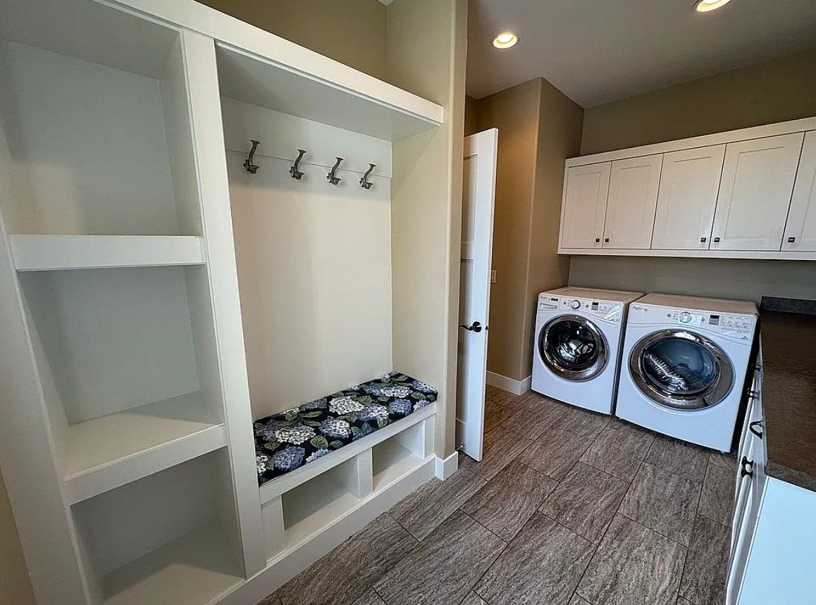 Two gas fireplaces, built-in bookcases, and a large mudroom with tiled flooring and laundry add to the functionality and charm of the main floor.