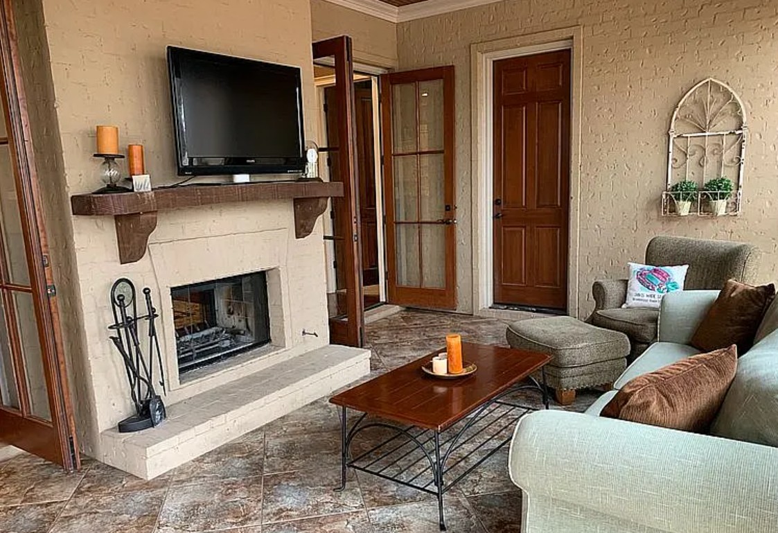 Additional features include blackout curtains in bedrooms, 10 ceiling fans, stained concrete flooring throughout the main level, and a propane-assisted double-sided fireplace extending from the great room into the sunroom.