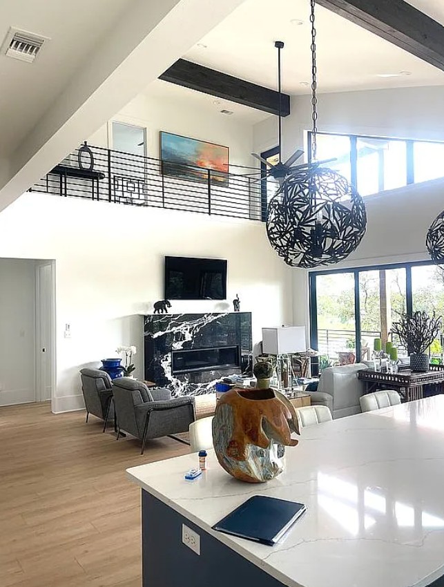 Inside, you’ll find custom iron railings, quartz countertops, and a marble fireplace that elevate the aesthetic.