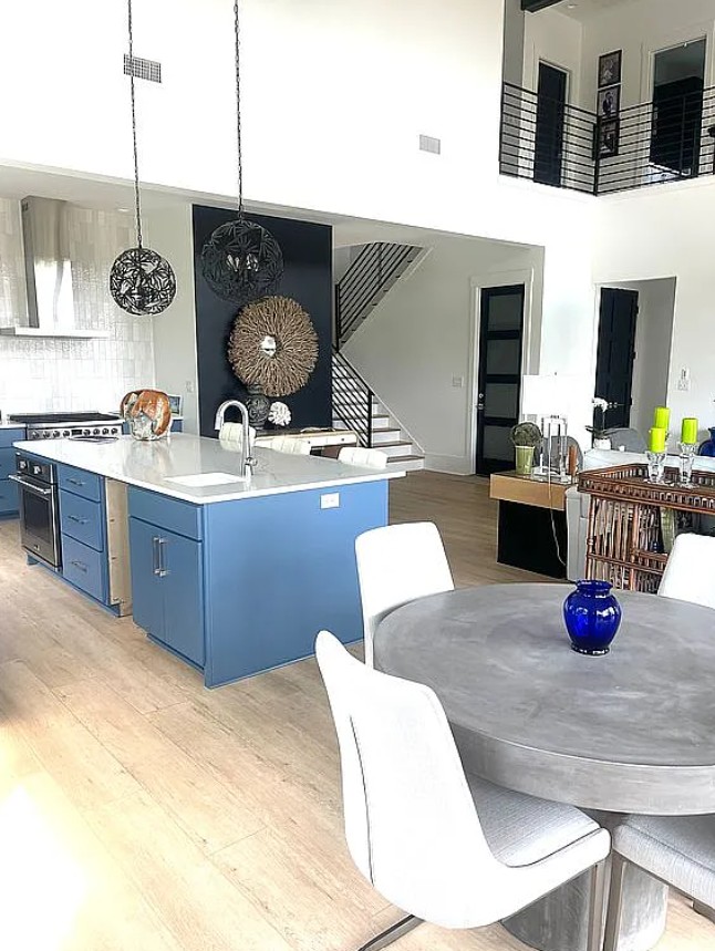 The kitchen is a chef’s dream, equipped with a column refrigerator and freezer, gas range, electric oven, ice machine, dishwasher, and drawer microwave all built for convenience and style.