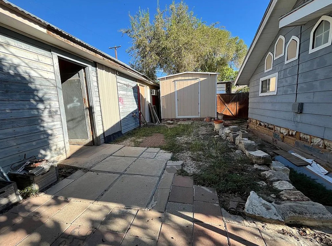This property features a detached storage shed/garage in the back, ideal for additional storage, a workshop, or parking.
