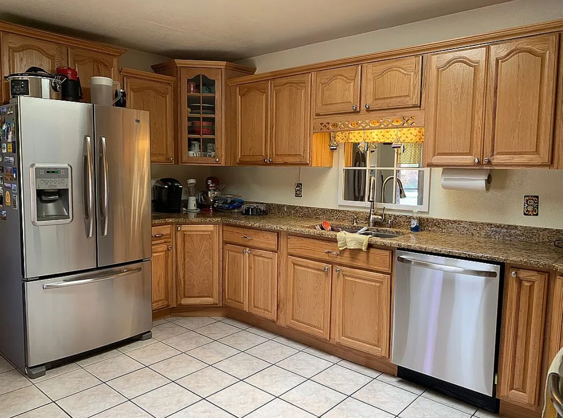 The kitchen is a chef’s dream, featuring stainless steel appliances, hickory cabinets, and granite countertops for a modern yet warm touch.