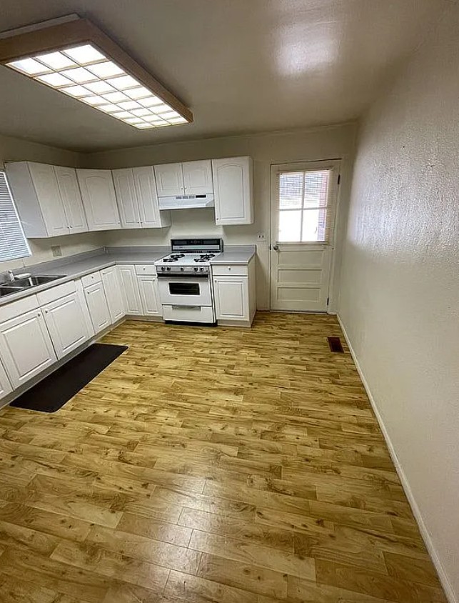 The kitchen is roomy, with space for a dining area, and has been lightly used since receiving new cabinets and flooring.