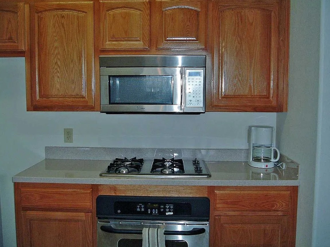 The kitchen comes fully equipped with stainless steel appliances and Corian countertops, combining durability with sleek, modern appeal.