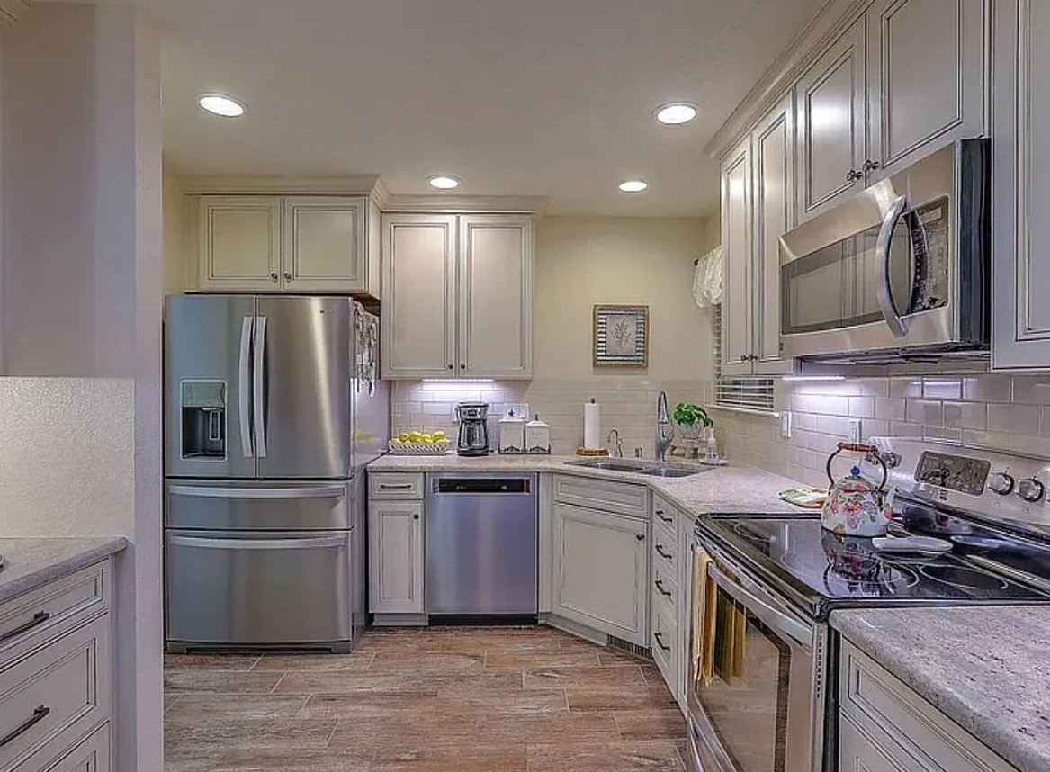 There is also a visible oil stain on the driveway, and while the tile flooring is modern, the current style may not appeal to everyone and could be a candidate for updating.
