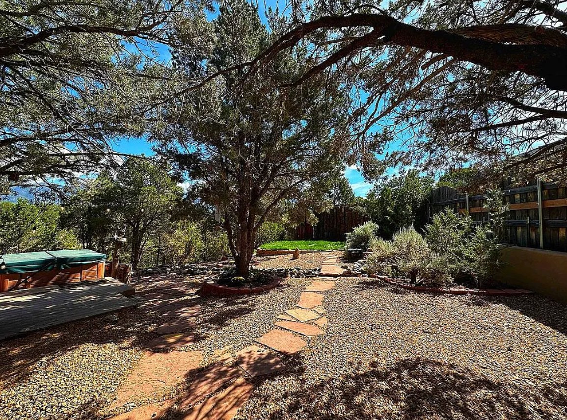 The property features a shared well, mature piñon and juniper landscaping, and a private oasis feel.
