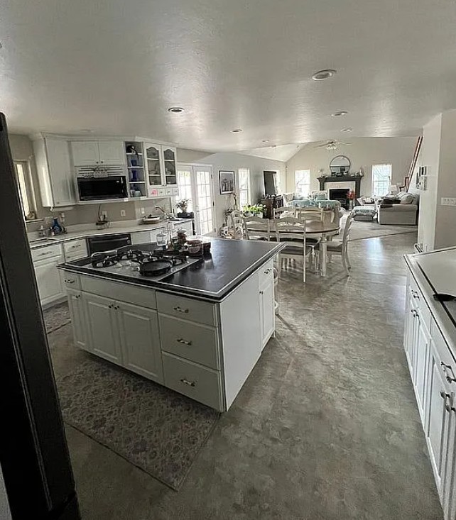 The home features a spacious open floor plan connecting the upgraded kitchen to the family room with vaulted ceilings and a cozy wood-burning fireplace, perfect for gatherings.