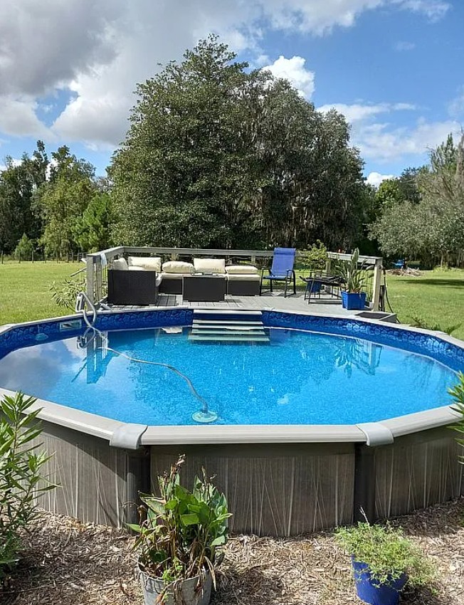 The cabin also features a built-in, wall-to-wall closet, a mid-size 18 foot round pool with a 16x16 stained and painted deck, and a covered outdoor kitchen (under construction) with hookups for gas, water, electric, and refrigerator.