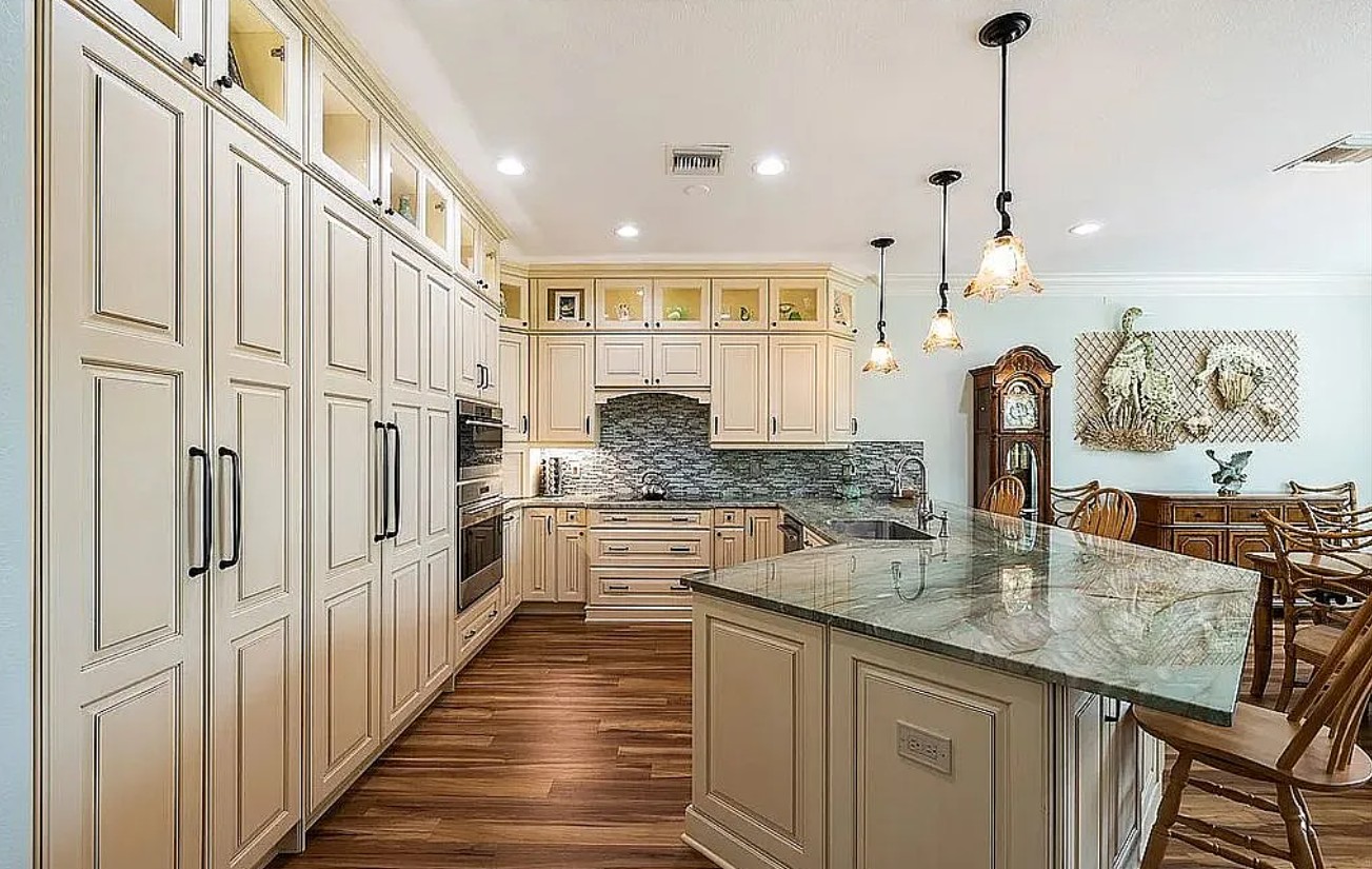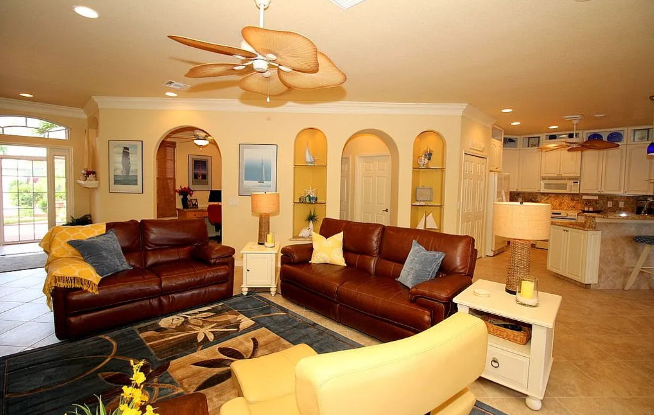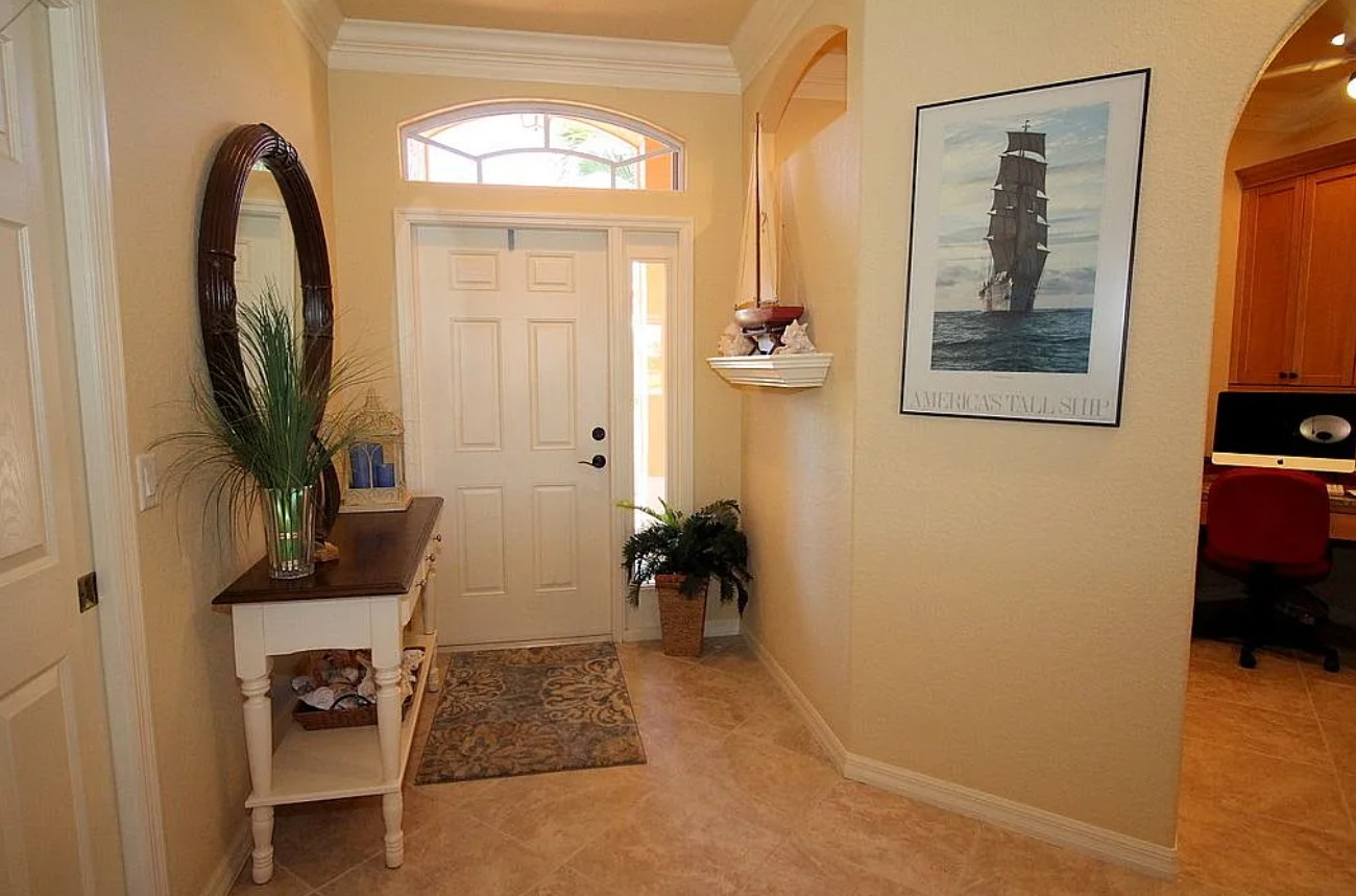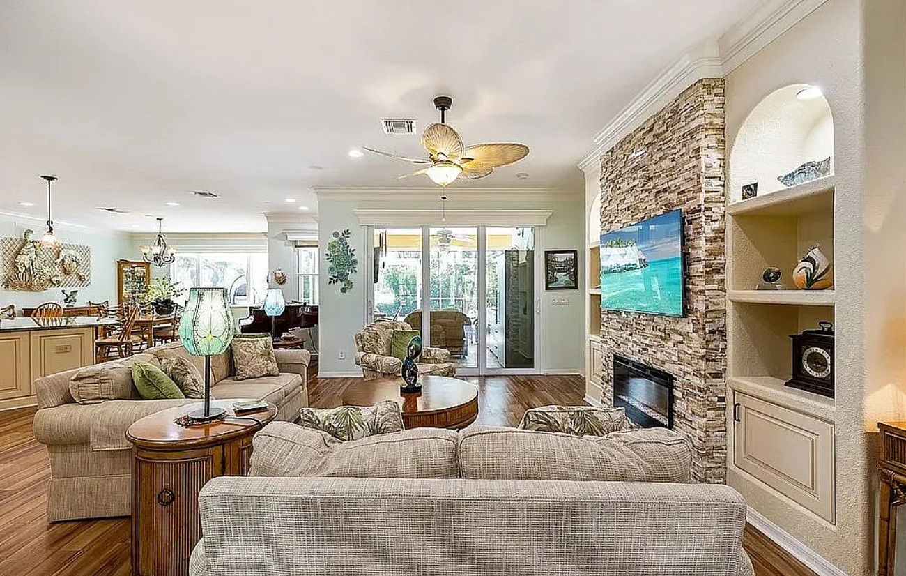 The home is equipped with impact-resistant vinyl windows, custom valances, and hurricane shutters to provide both beauty and safety.