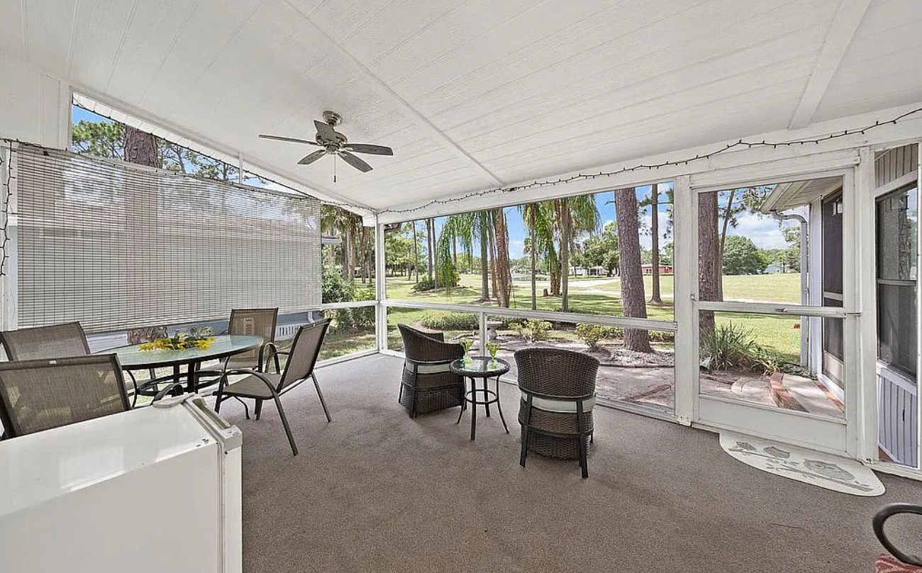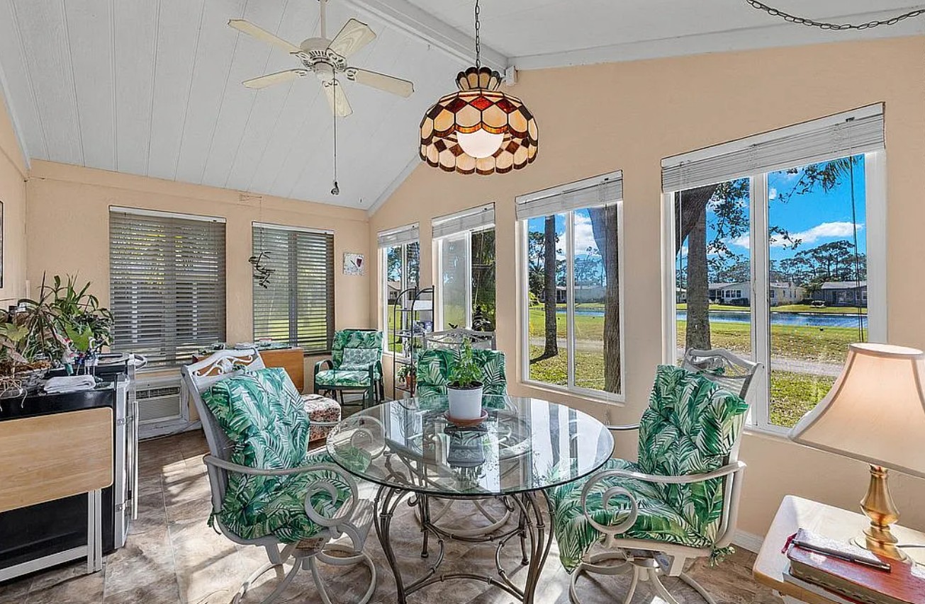 The sunny Florida room is a great space for morning coffee, reading, or enjoying the peaceful views.
