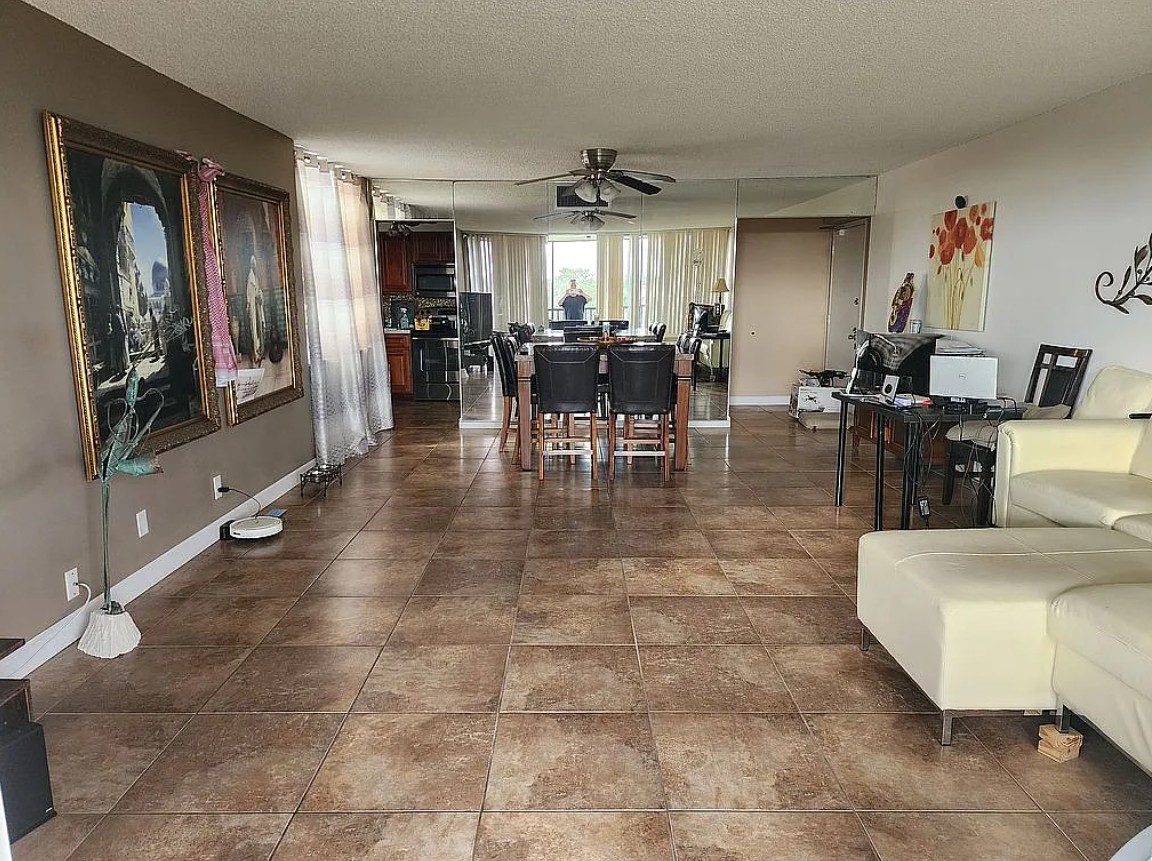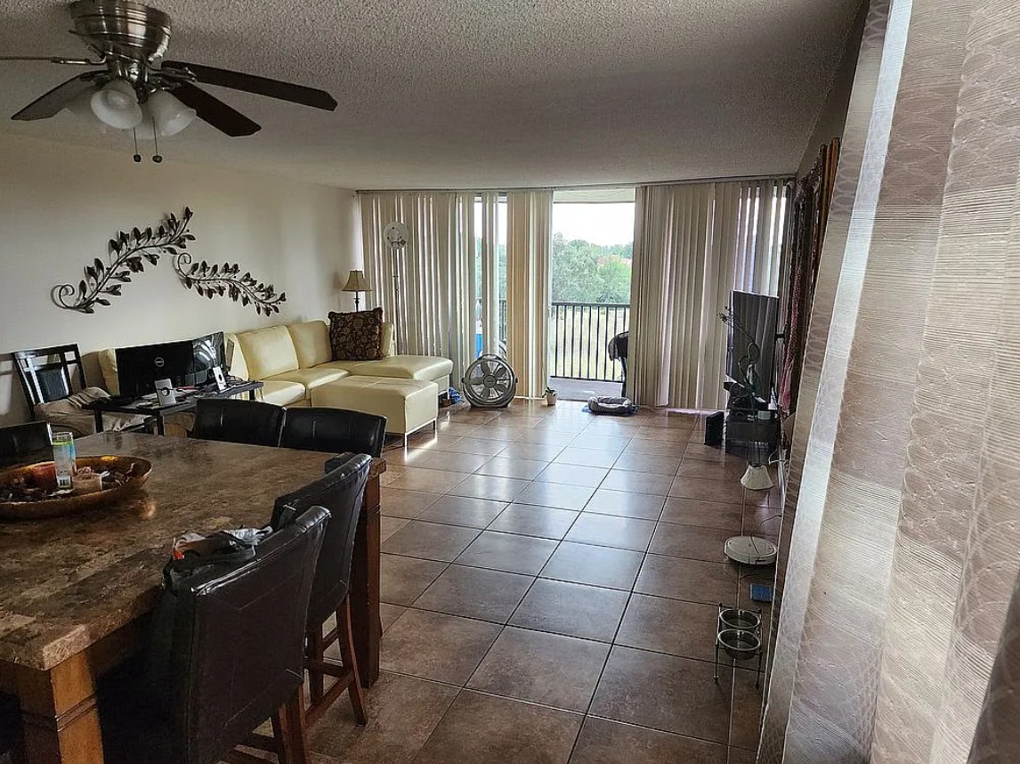 The condo features tile flooring throughout, a spacious dining area, and generous living space, all filled with natural light.