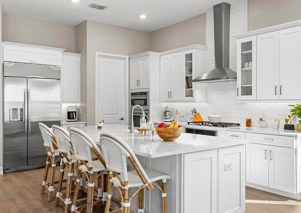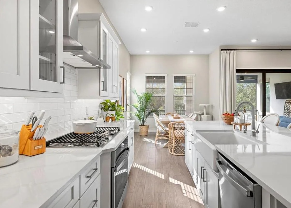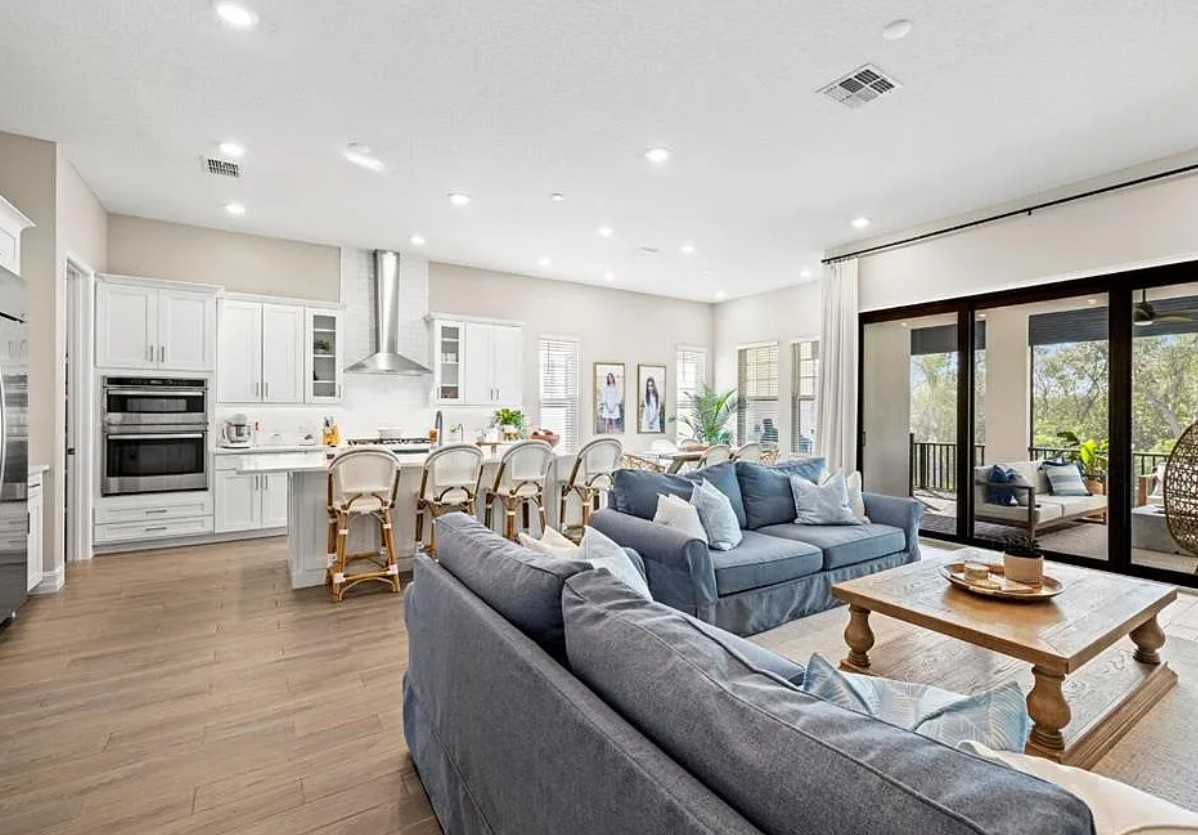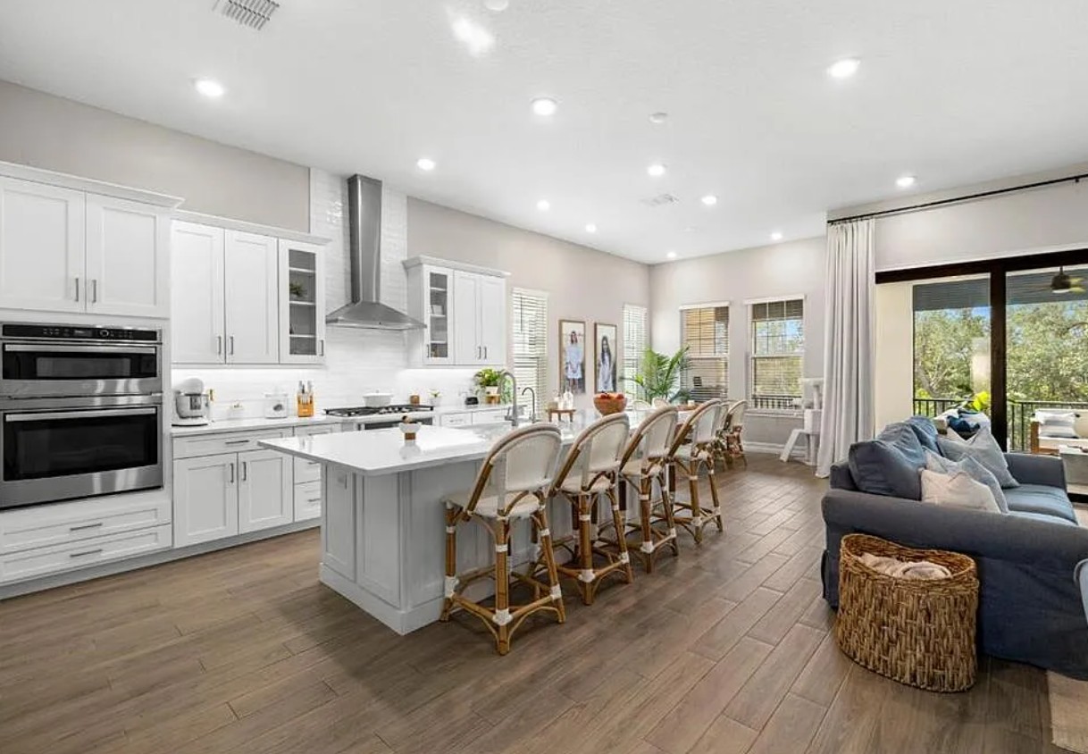 The kitchen and living areas flow seamlessly into the spacious screened lanai, creating the perfect space for entertaining or relaxing in the Florida sun.