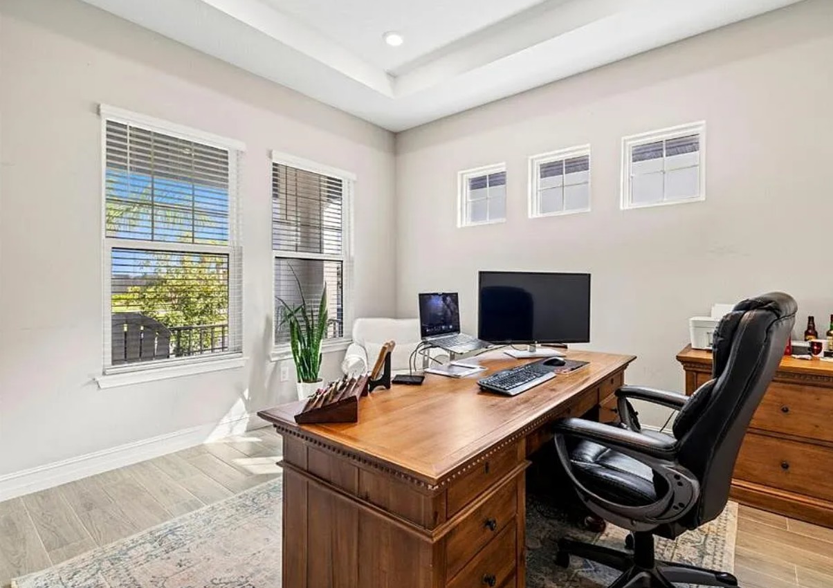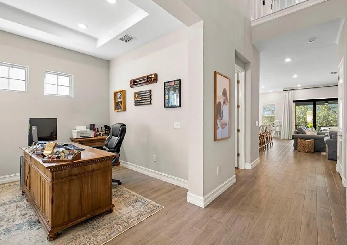 Inside, the home features a flexible floor plan with a first-floor bedroom, perfect for guests or multi-generational living, and a dedicated office, ideal for working from home.