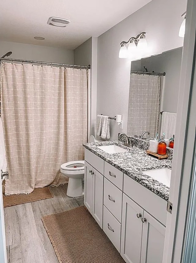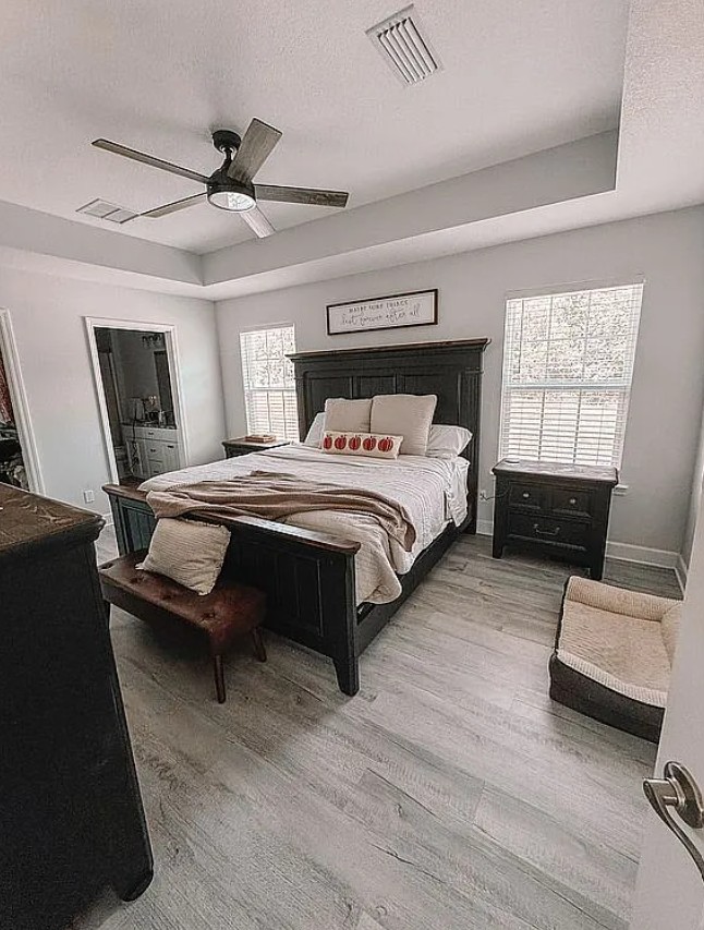 The spacious master suite is a true retreat, featuring a private en-suite bathroom with double Jack and Jill sinks, elegant fixtures, and ample storage.