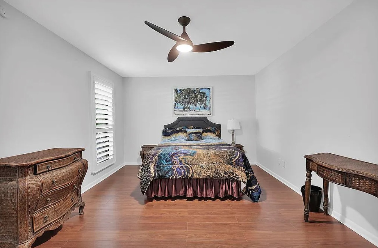 The second bedroom is generously sized with a full bathroom nearby, ideal for guests or a home office.