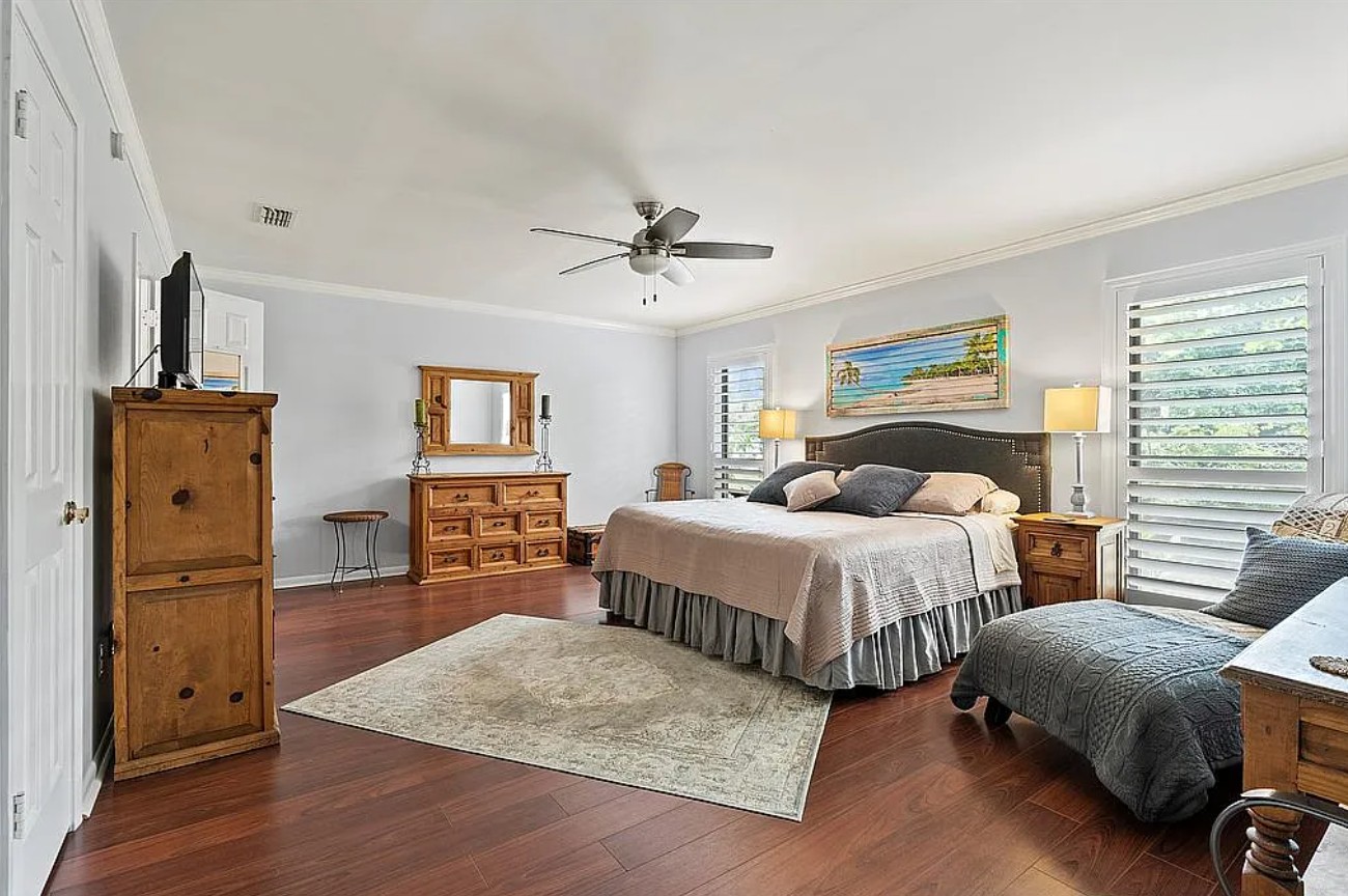 The oversized primary suite offers a walk-in closet and a luxurious garden soaking tub.