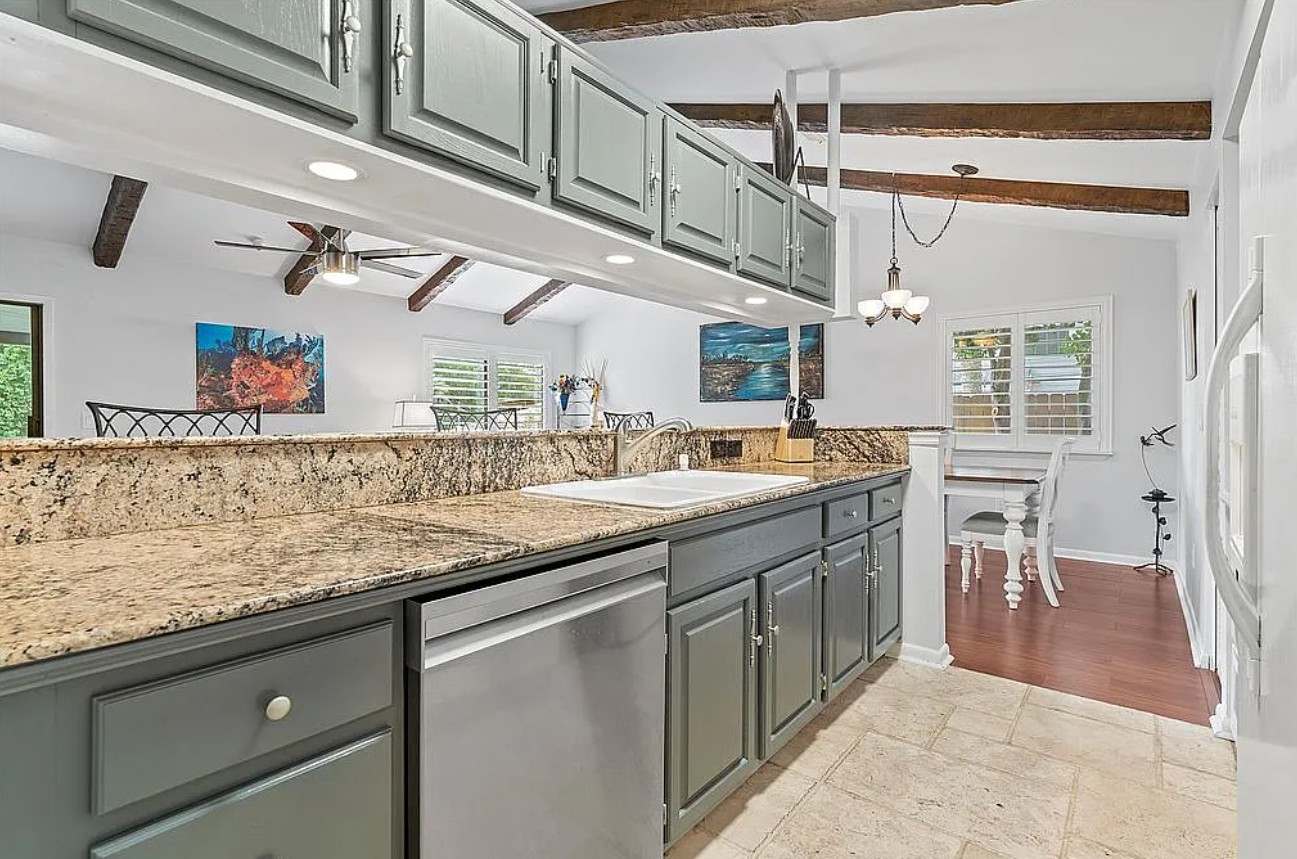 The kitchen includes granite countertops, bar seating, and flows seamlessly into the main living area, creating a perfect space for entertaining.