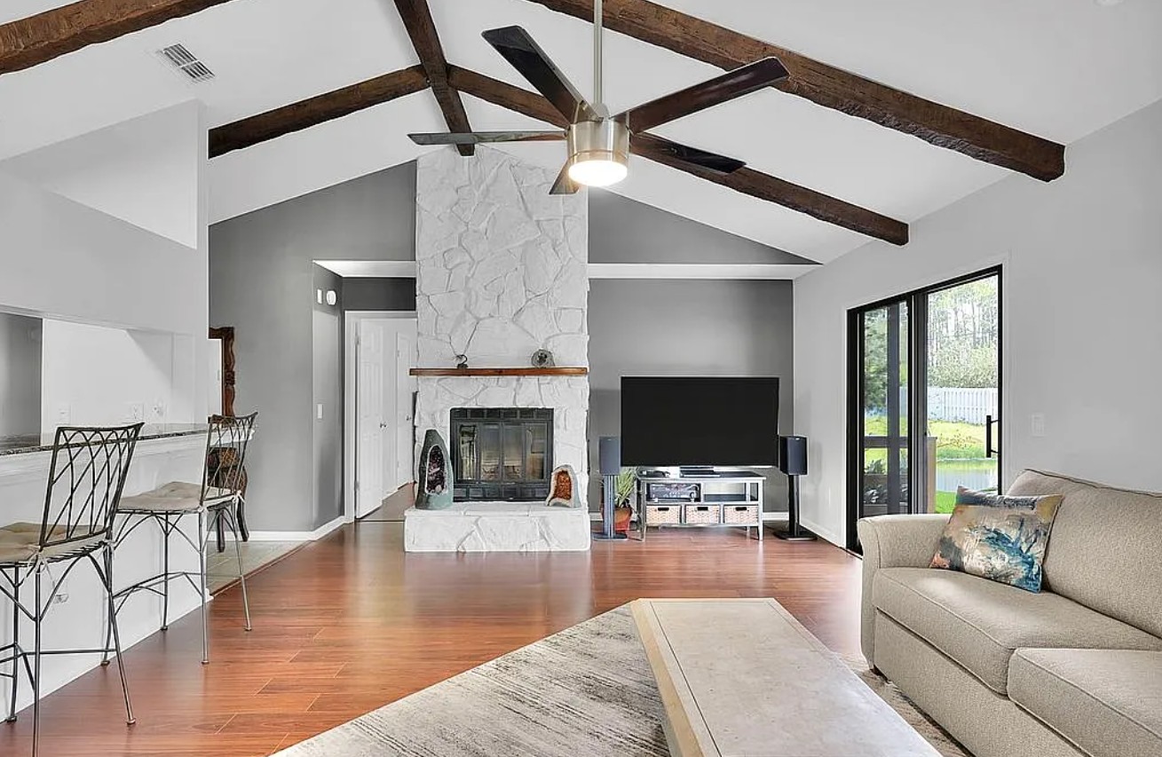 Inside, the elegant open floor plan features a vaulted great room ceiling with custom wood beams and a cozy wood-burning fireplace.