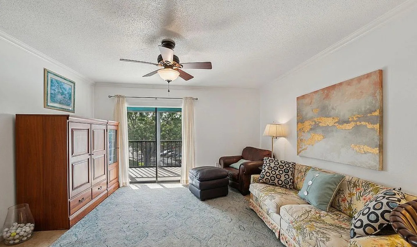 The open floor plan is ideal for relaxing or entertaining, with large windows letting in plenty of natural light.