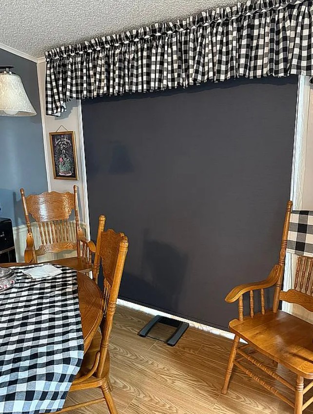 The open-concept living and dining area is filled with natural light, thanks to glass doors on both sides of the room.