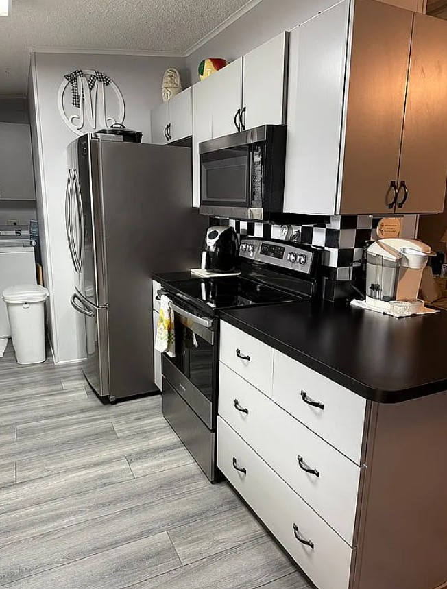 The kitchen was fully remodeled in 2020, featuring solid wood cabinetry, pull-out drawers for pots and pans, a pantry with pull-out shelves, and modern appliances including a stove, refrigerator, dishwasher, and microwave.