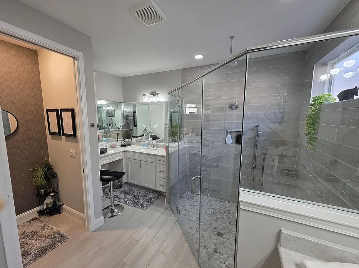 The master suite is a true retreat with tray ceiling, recessed lighting, two walk-in closets with custom shelving, and a spa-like bath featuring a seamless glass shower with Thermostatic valve.