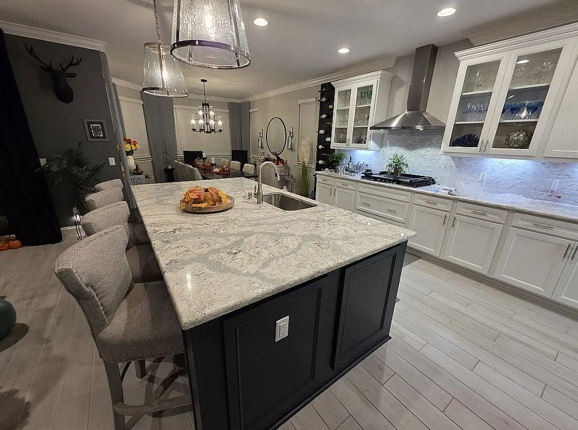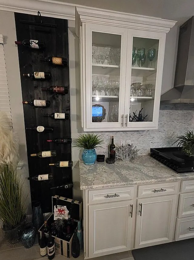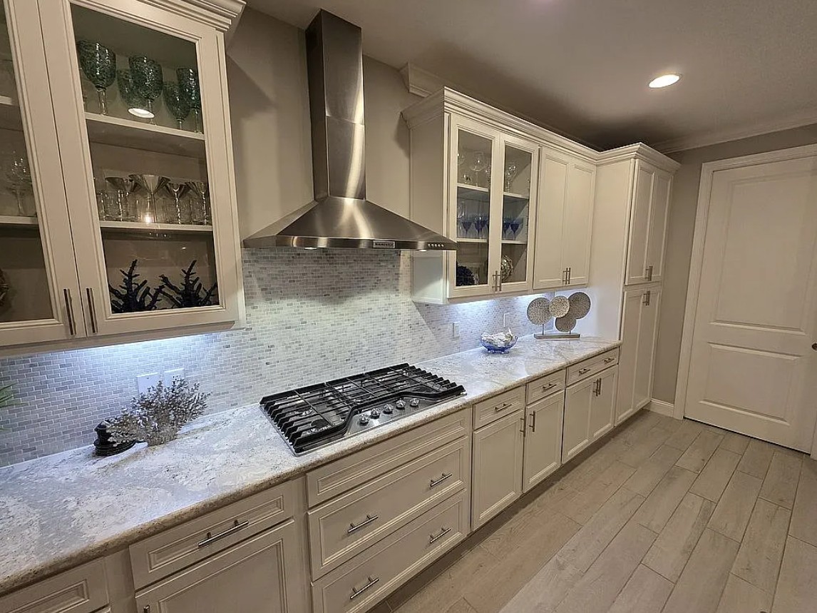 The gourmet kitchen features KitchenAid Pro stainless steel appliances, Cambria quartz countertops, gas cooktop, in-wall ovens, and a custom wine rack, perfect for entertaining.