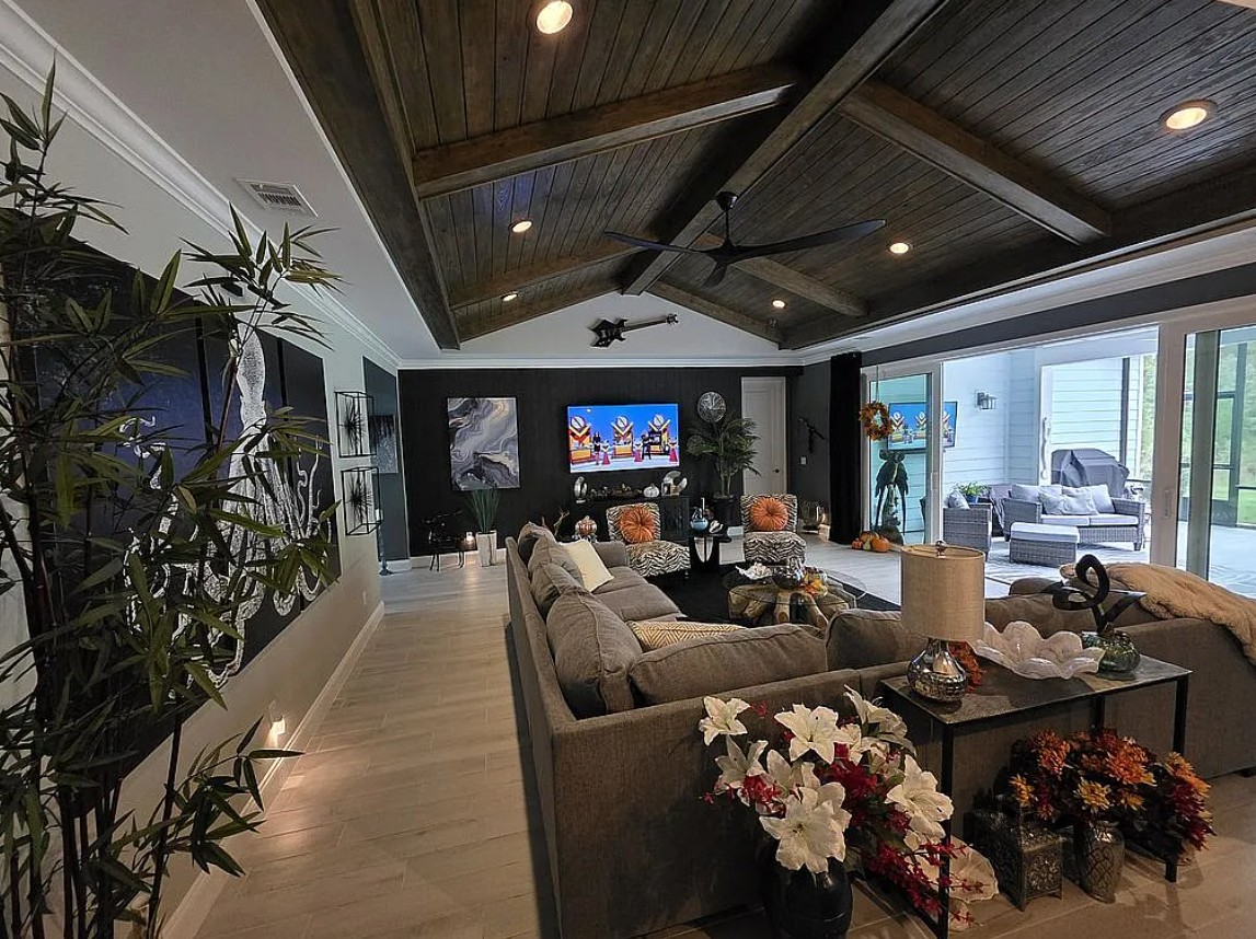 A spacious family room with 23’ x 20’ vaulted ceiling and 16’ sliding doors opens to an extended tiled floor lanai with a Joli 500 Vita Spa hot tub and gas hookup for a natural gas grill.