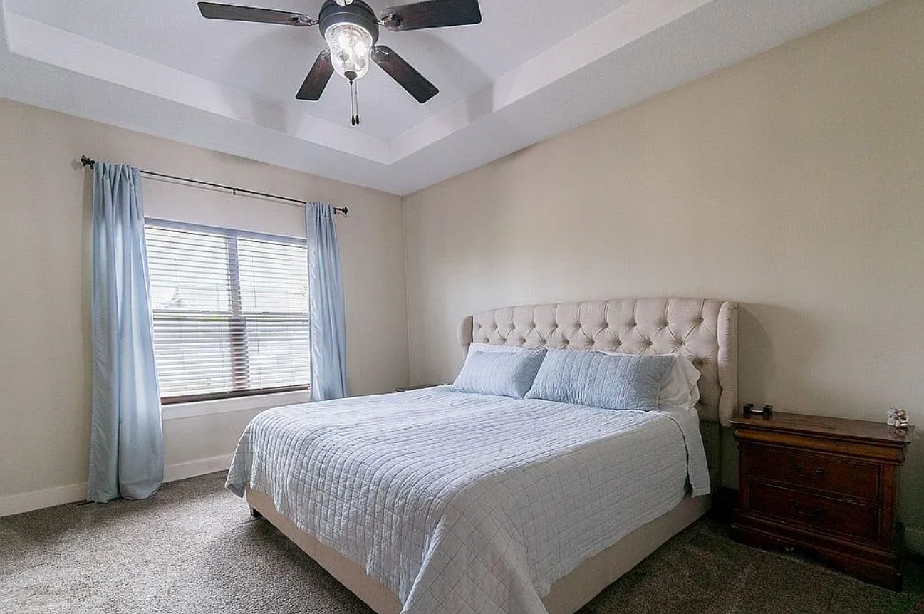 The primary suite offers a tray ceiling, walk-in closet, and a private bath complete with solid-surface counters, tile flooring, and a tub/shower combo.