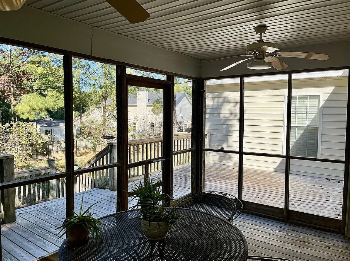 Outdoor living shines with a screened-in porch and custom deck overlooking a vibrant backyard oasis.