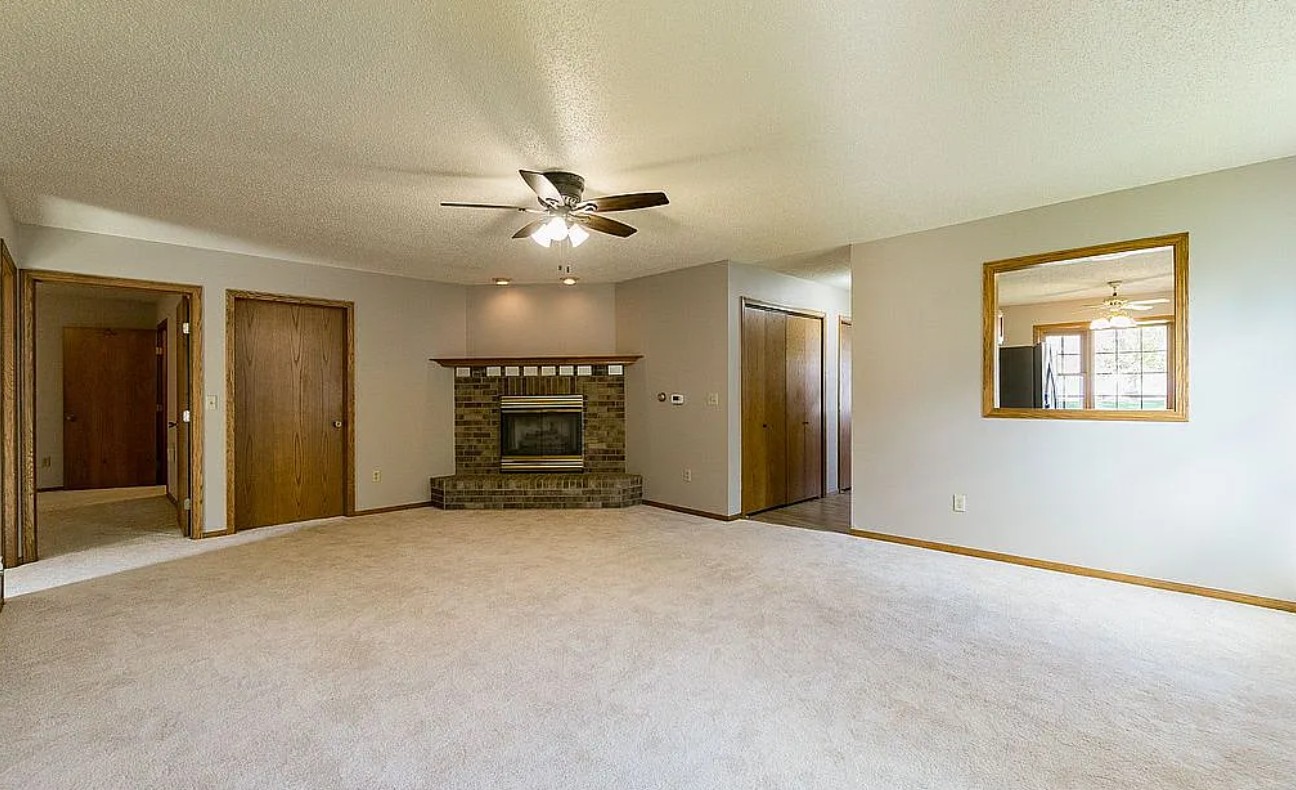The living room is bright and welcoming with fresh paint, a new ceiling fan, and a cozy fireplace.