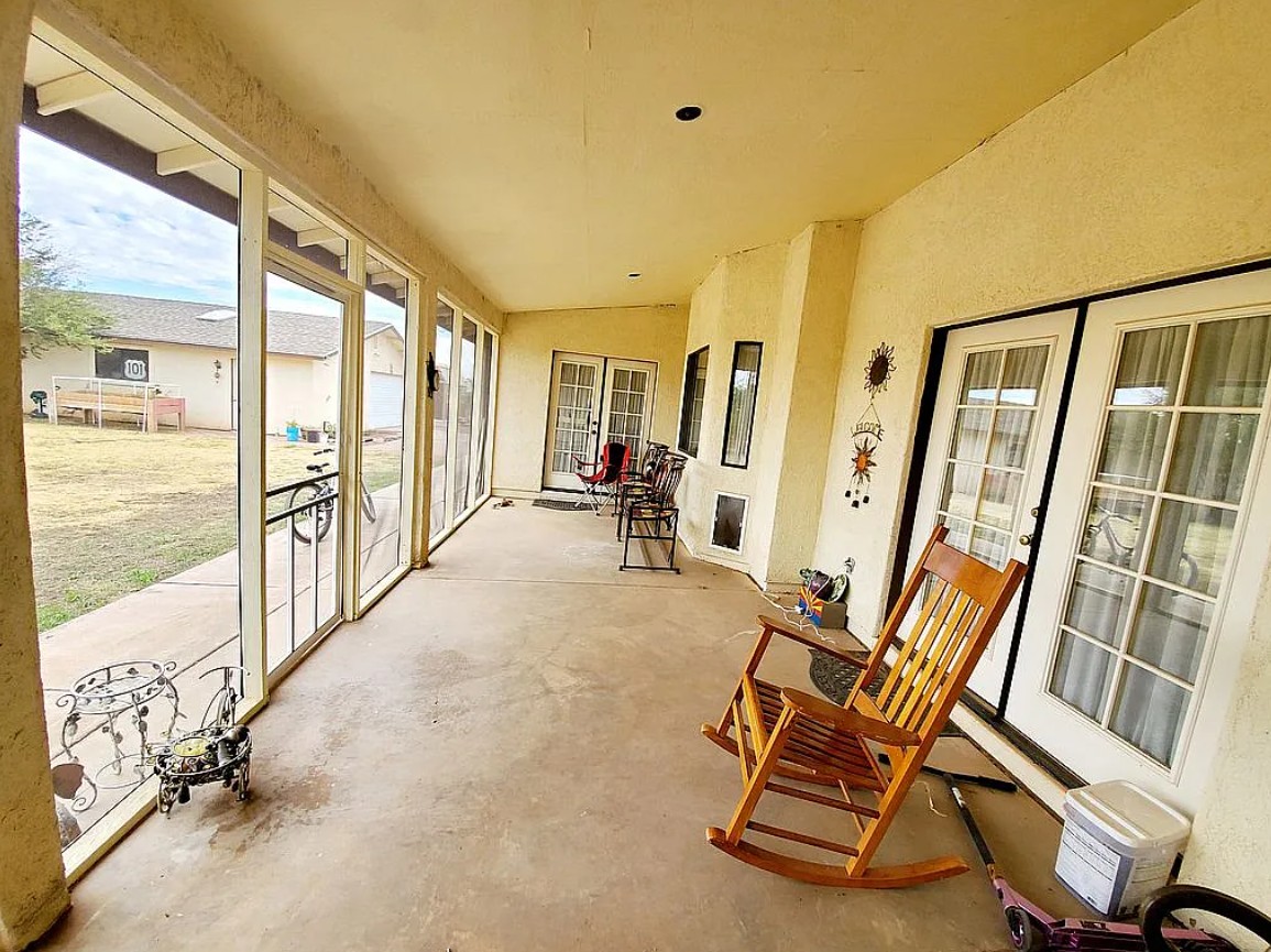 The property is fully fenced and includes a private well, 1,000-square-foot shop, and screened-in back patio with hot tub, ideal for relaxing desert evenings.