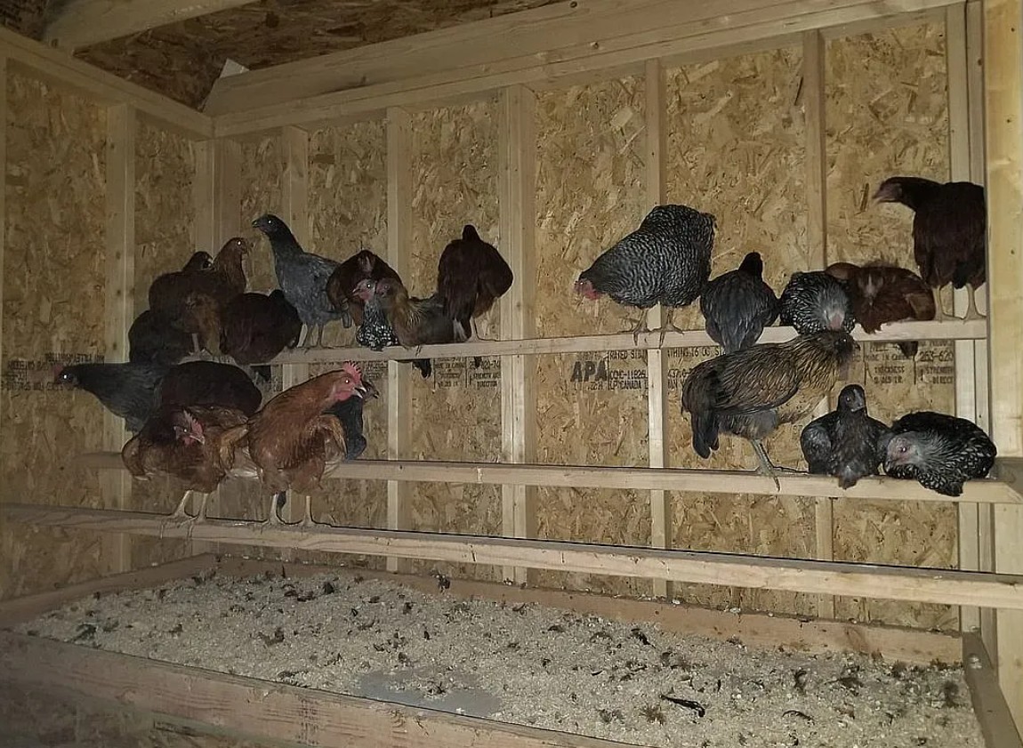Outdoor features include a barn-style chicken coop with 15 young hens just beginning to lay, beekeeping equipment, and a large garden area with permanent raised beds for vegetables or flowers.