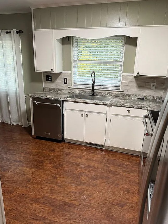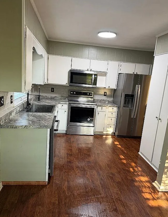 The home features newer double pane windows, like-new plank flooring throughout, and a modern kitchen equipped with all stainless-steel appliances, including a stove, side by side refrigerator, dishwasher, and microwave.