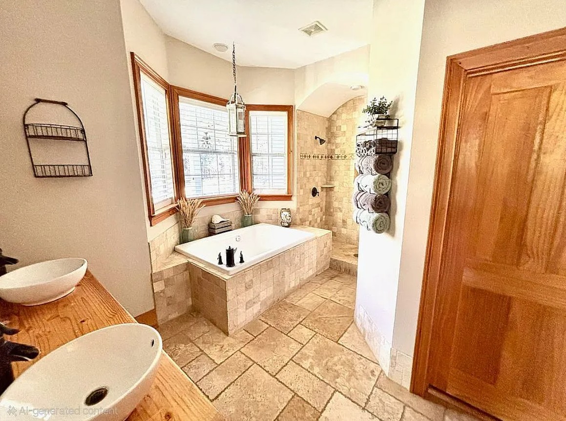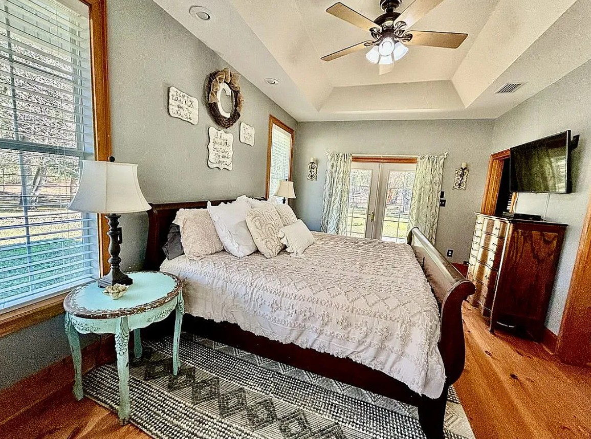 The master suite includes a tray ceiling, French doors to the backyard, abundant natural light, and a luxurious bathroom with a garden tub, double vanity, separate shower, and walk-in closet.