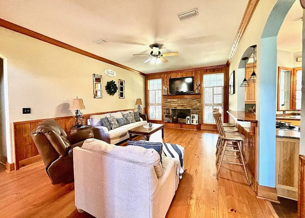 Inside, the open floor plan boasts 10-foot ceilings, custom trim, and a cozy gas fireplace.